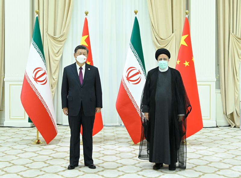 當(dāng)?shù)貢r(shí)間9月16日上午,國(guó)家主席習(xí)近平在撒馬爾罕國(guó)賓館會(huì)見伊朗總統(tǒng)萊希。新華社記者 申宏 攝