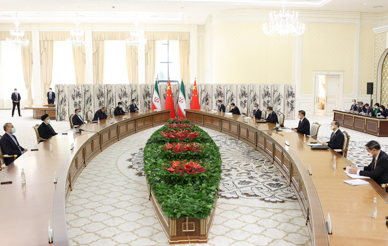 當(dāng)?shù)貢r(shí)間9月16日上午,國(guó)家主席習(xí)近平在撒馬爾罕國(guó)賓館會(huì)見伊朗總統(tǒng)萊希。新華社記者 丁海濤 攝