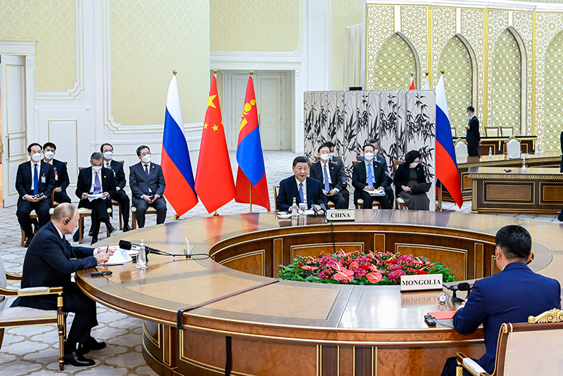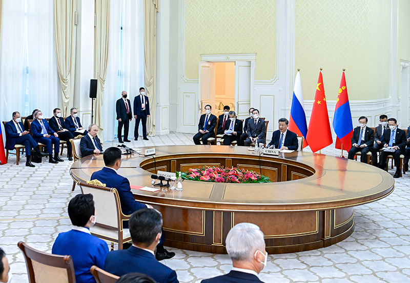 當?shù)貢r間9月15日下午,國家主席習近平在撒馬爾罕國賓館同俄羅斯總統(tǒng)普京、蒙古國總統(tǒng)呼日勒蘇赫舉行中俄蒙三國元首第六次會晤。新華社記者 翟健嵐 攝