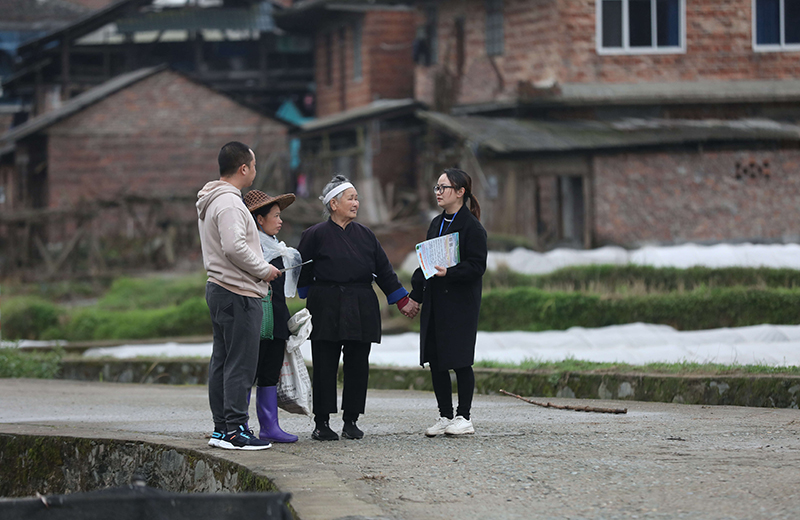 在廣西柳州市三江侗族自治縣良口鄉(xiāng)南寨村,紀(jì)檢監(jiān)察干部(右一、左一)在了解惠農(nóng)政策落實情況(2022年3月24日攝)。新華社記者 黃孝邦 攝
