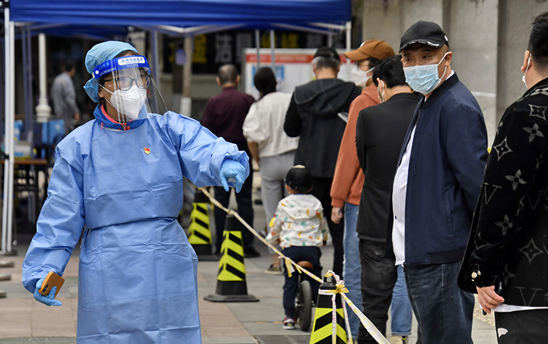 共產(chǎn)黨員、北京八里莊街道機關(guān)干部張茜(左)在核酸篩查現(xiàn)場進行秩序維護(2022年5月11日攝)。新華社記者 李欣 攝