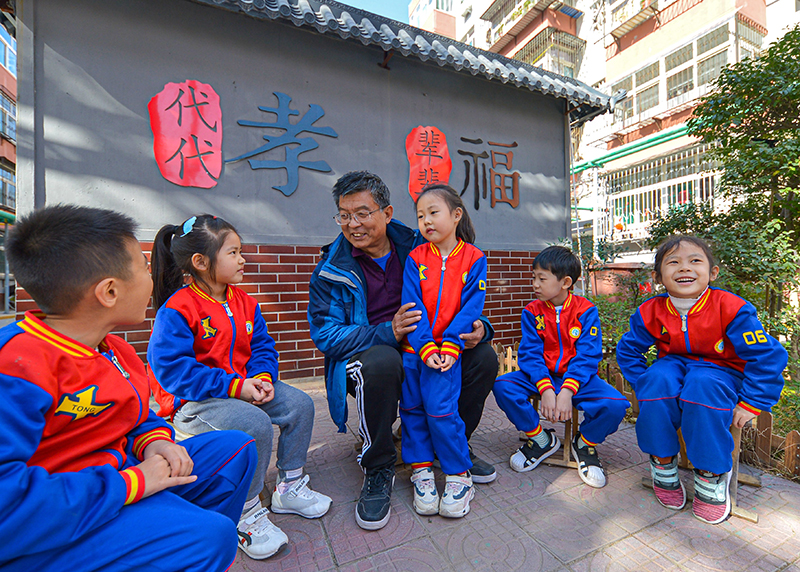 在河北省邯鄲市邯山區(qū)開展的“聽爺爺奶奶講家風(fēng)”主題活動中,宣講員向孩子們講家風(fēng)家訓(xùn)故事(2020年11月2日攝)。新華社記者 王曉 攝