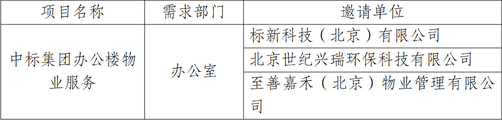 按照《中國標(biāo)準(zhǔn)科技集團(tuán)有限公司采購工作管理辦法(試行)》要求,現(xiàn)對中標(biāo)集團(tuán)辦公樓物業(yè)服務(wù)項(xiàng)目競爭性談判邀請單位公示。