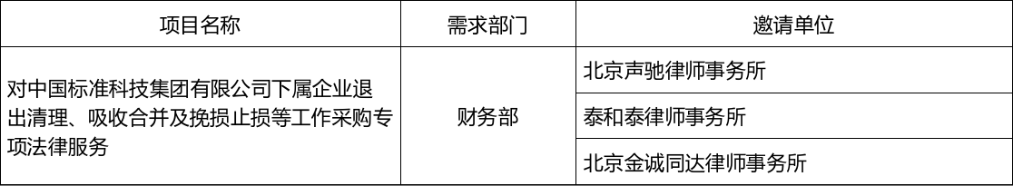 按照《中國標(biāo)準(zhǔn)科技集團(tuán)有限公司采購工作管理辦法(試行)》要求,現(xiàn)對(duì)中國標(biāo)準(zhǔn)科技集團(tuán)有限公司下屬企業(yè)退出清理、吸收合并及挽損止損等工作采購專項(xiàng)法律服務(wù)項(xiàng)目競(jìng)爭(zhēng)性談判邀請(qǐng)單位進(jìn)行公示。