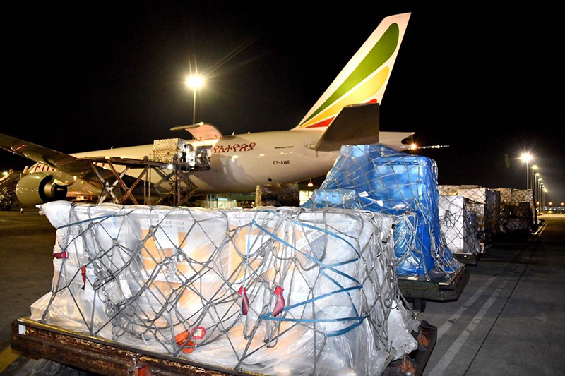 2020年4月14日,中國(guó)援助的抗疫物資抵達(dá)南非約翰內(nèi)斯堡奧坦博國(guó)際機(jī)場(chǎng)。新華社發(fā)(中國(guó)駐南非大使館供圖)