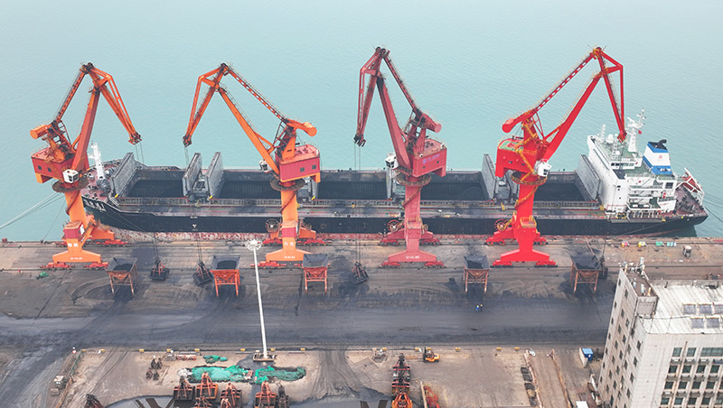 11月28日,在江蘇連云港港煤炭碼頭,貨輪在卸載到港的電煤(無人機(jī)照片)。