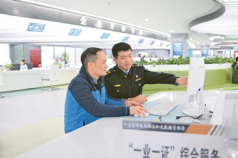 優(yōu)化營(yíng)商環(huán)境,是培育和激發(fā)經(jīng)營(yíng)主體活力、增強(qiáng)發(fā)展內(nèi)生動(dòng)力的關(guān)鍵之舉。圖為2023年11月27日,在湖北省宜昌市市民之家市場(chǎng)監(jiān)管局窗口,工作人員指導(dǎo)企業(yè)人員在線(xiàn)辦理企業(yè)登記注冊(cè)業(yè)務(wù)。 湖北省宜昌市市場(chǎng)監(jiān)管局供圖