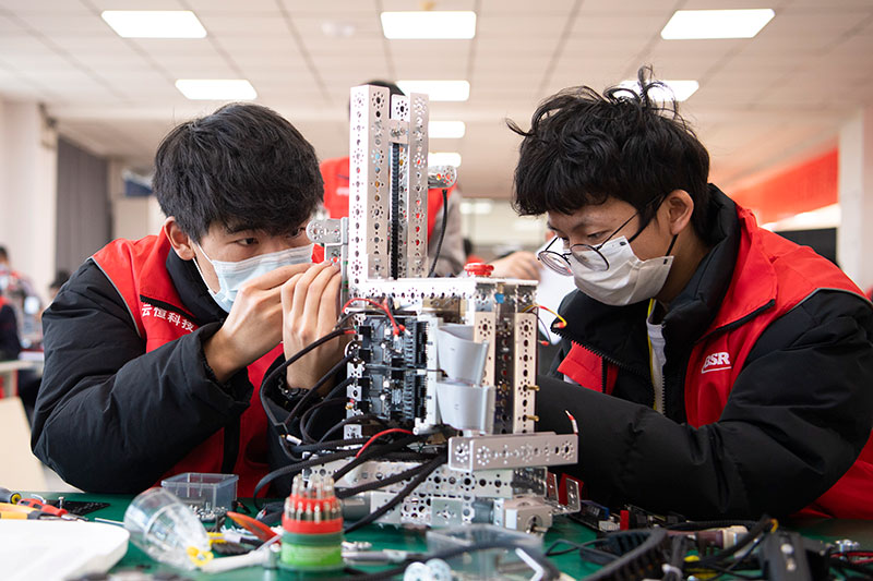2021年12月25日,第三屆山西省職業(yè)技能大賽參賽選手在位于山西機(jī)械高級技工學(xué)校的移動(dòng)機(jī)器人項(xiàng)目賽場進(jìn)行比賽。新華社記者 楊晨光 攝