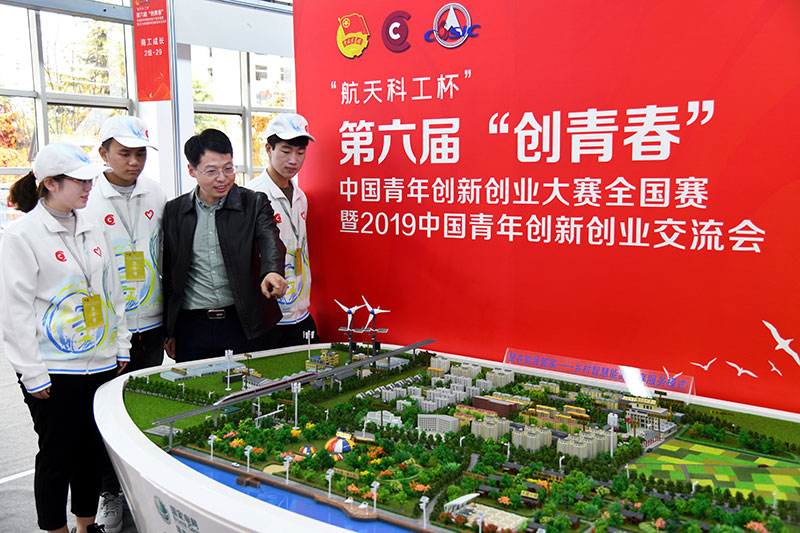 2019年11月1日,在山東青島舉行的第六屆“創(chuàng)青春”中國青年創(chuàng)新創(chuàng)業(yè)大賽全國賽暨2019中國青年創(chuàng)新創(chuàng)業(yè)交流會上,參會人員在給志愿者介紹新鄉(xiāng)村智慧能源服務(wù)模式。新華社記者 李紫恒 攝
