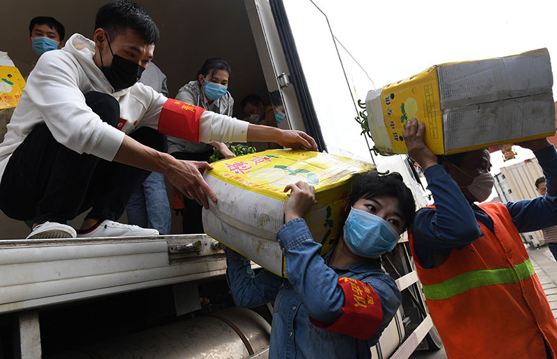 2020年3月3日,在廣西南寧國際鐵路港,南寧車務(wù)段“青年突擊隊(duì)”隊(duì)員黃瑩瑩(右二)在搬運(yùn)廣西馳援湖北物資。新華社記者 陸波岸 攝
