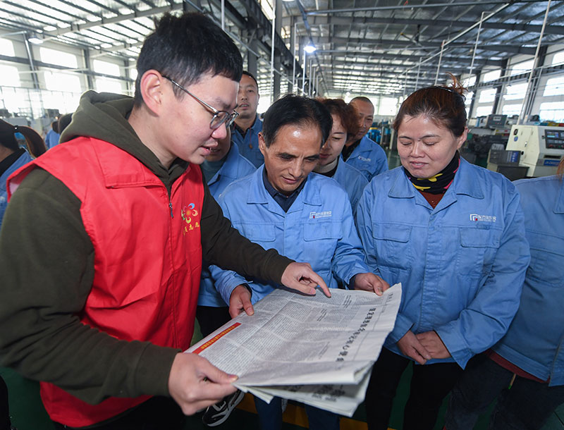 2021年11月24日,在浙江省杭州市臨安區(qū)一家公司車間,青年黨員志愿者在宣講黨的十九屆六中全會精神。新華社記者 徐昱 攝